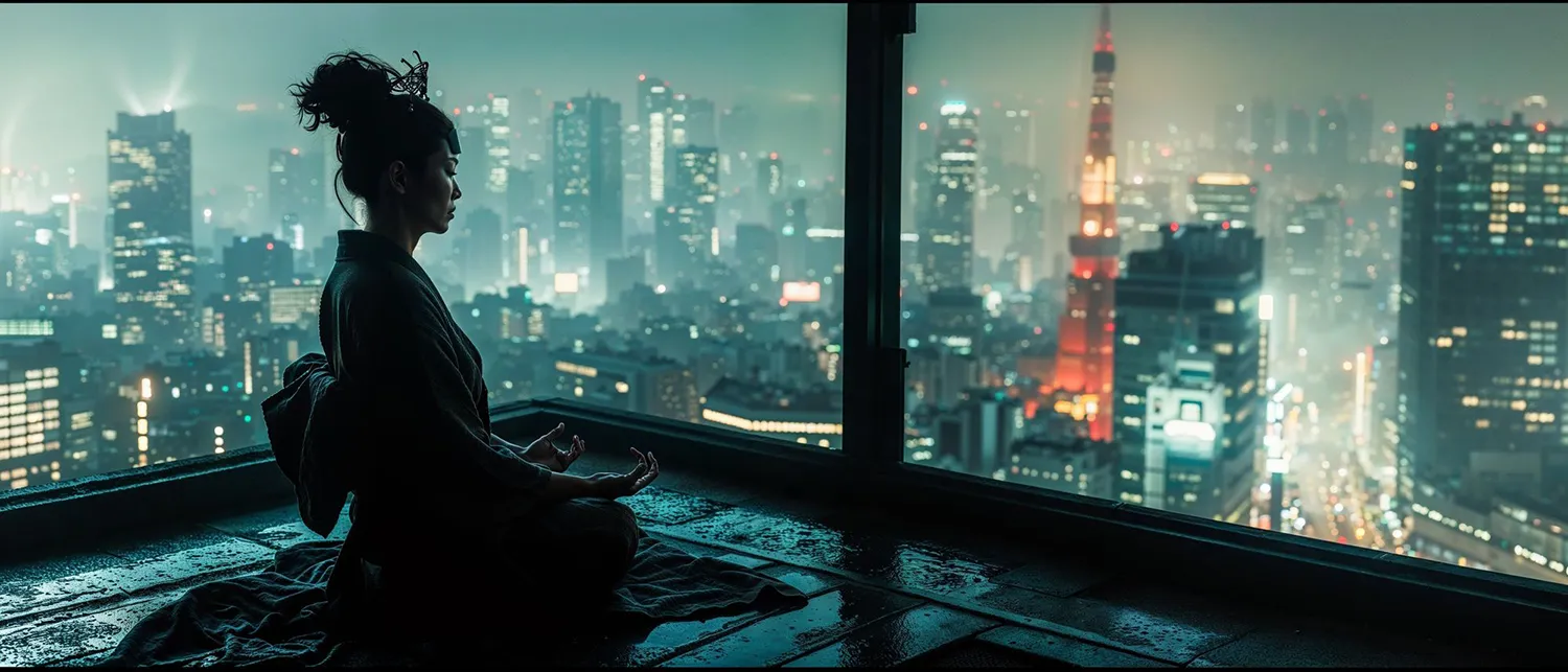 Cinematic, photo, enigmatic cyborg samurai woman, meditating in a futuristic Tokyo cityscape, ARRIFLEX 35 BL Camera, Canon K35 Prime Lenses, Foggy –ar 21:9 –style raw